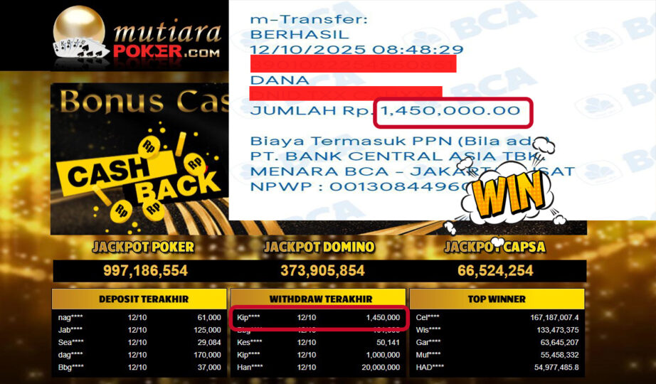 Bukti Withdraw ( 1,450,000,- ) Member Setia MutiaraPoker