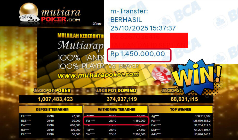 Bukti Withdraw ( 1,450,000,- ) Member Setia MutiaraPoker