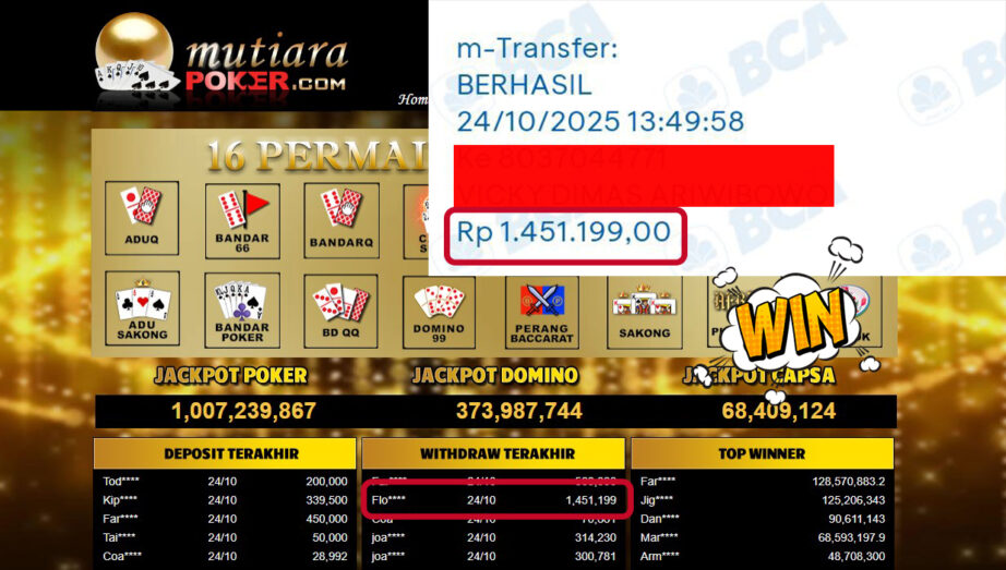 Bukti Withdraw ( 1,451,199,- ) Member Setia MutiaraPokerc