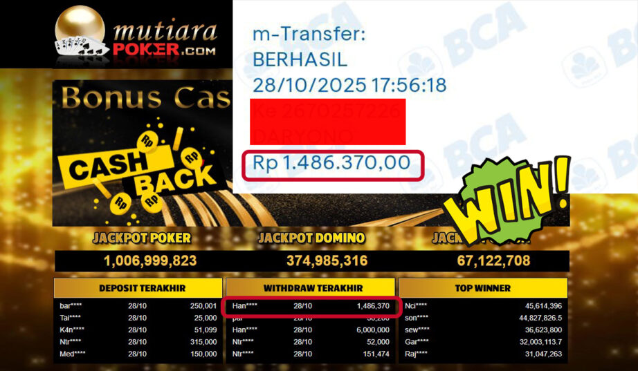 Bukti Withdraw ( 1,486,370,- ) Member Setia MutiaraPoker