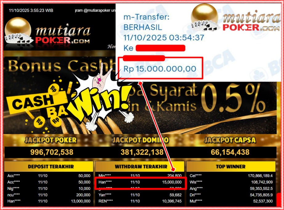 Bukti Withdraw ( 15,000,000,- ) Member Setia MutiaraPoker