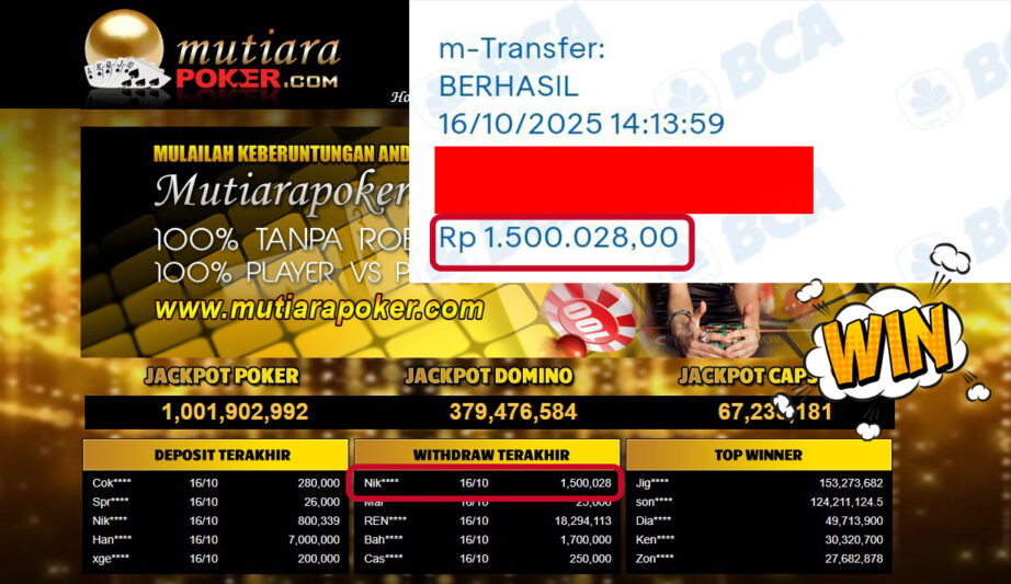 Bukti Withdraw ( 1,500,028,- ) Member Setia MutiaraPoker