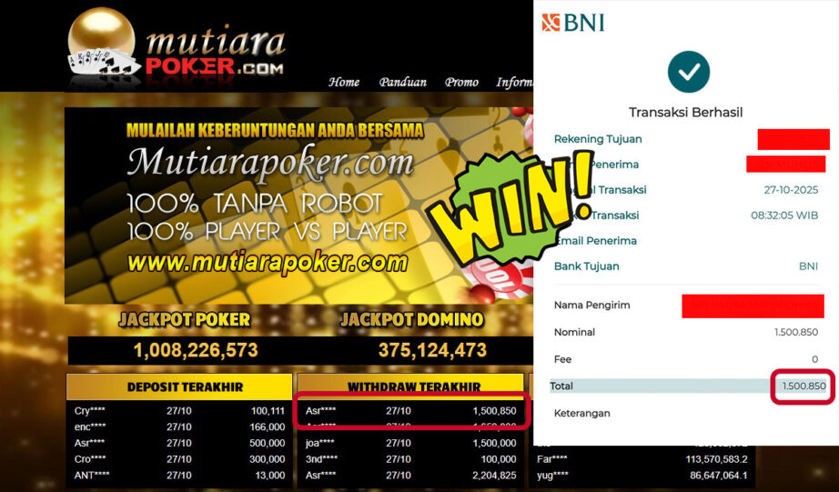 Bukti Withdraw ( 1,500,850,- ) Member Setia MutiaraPoker