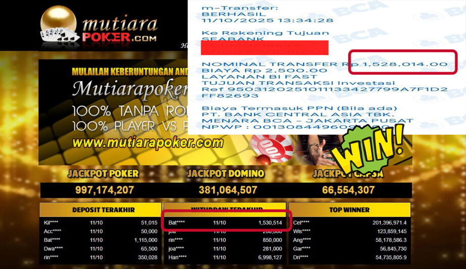 Bukti Withdraw ( 1,530,514,- ) Member Setia MutiaraPoker