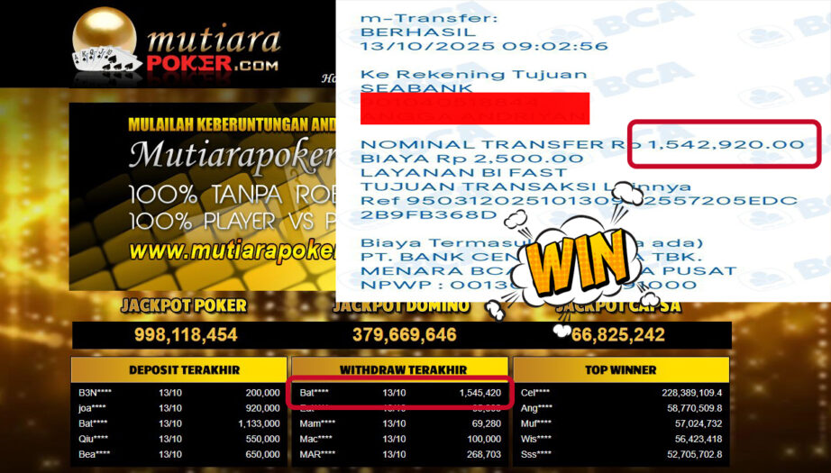 Bukti Withdraw ( 1,545,420,- ) Member Setia MutiaraPoker