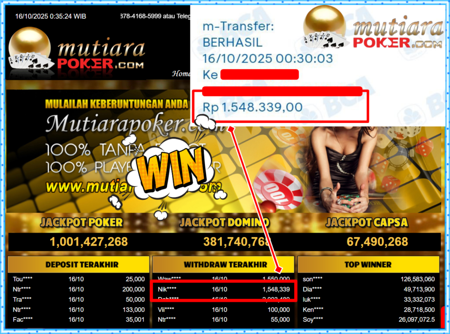 Bukti Withdraw ( 1,548,339,- ) Member Setia MutiaraPoker