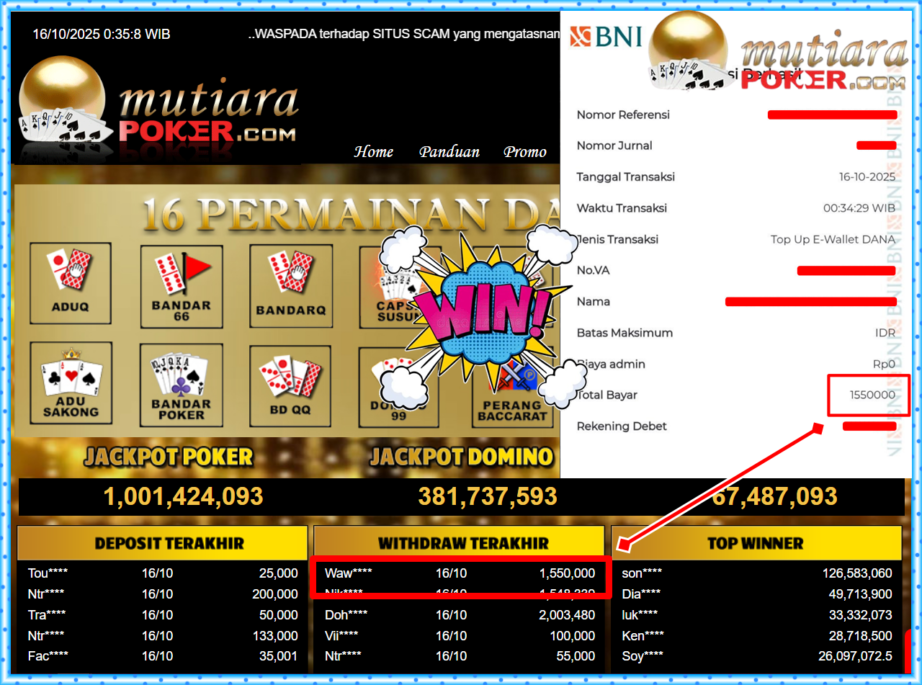 Bukti Withdraw MutiaraPoker