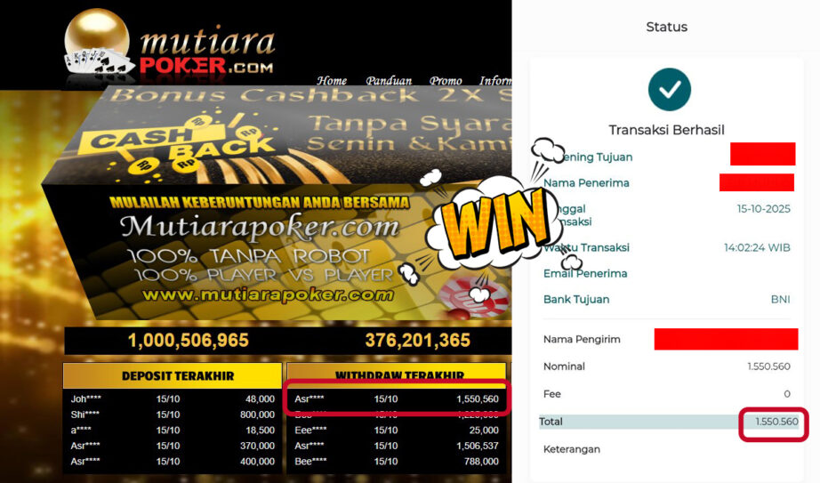Bukti Withdraw ( 1,550,560,- ) Member Setia MutiaraPoker