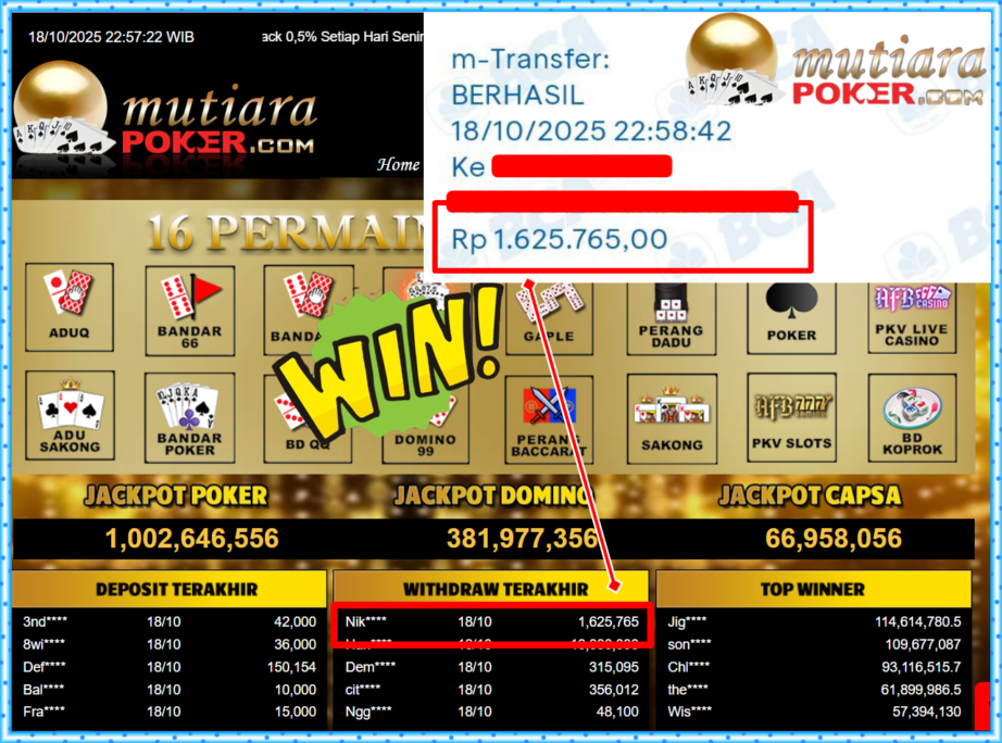 Bukti Withdraw ( 1,625,765,- ) Member Setia MutiaraPoker