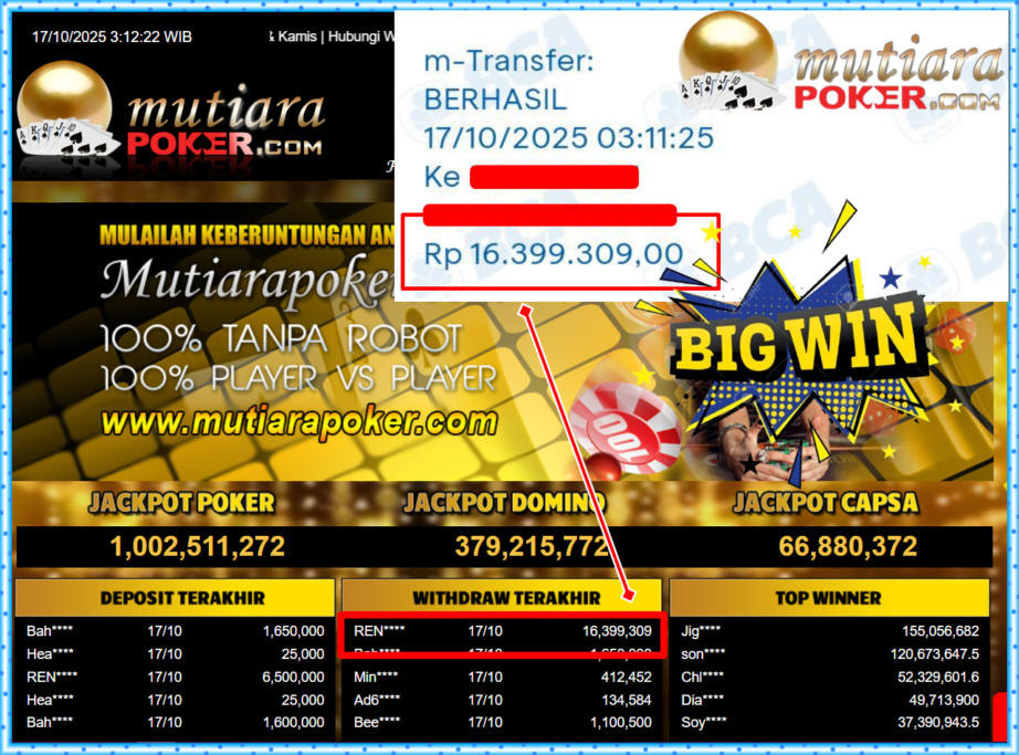 Bukti Withdraw ( 16,399,309,- ) Member Setia MutiaraPoker