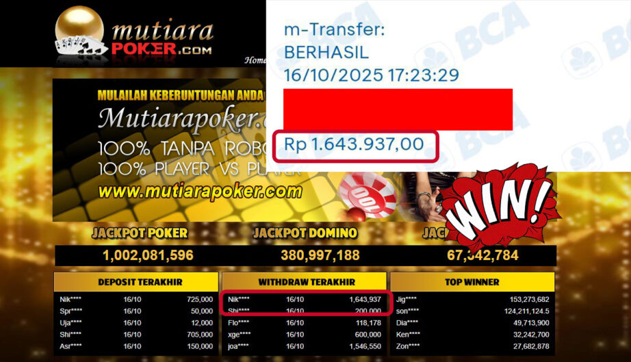 Bukti Withdraw ( 1,643,937,- ) Member Setia MutiaraPoker