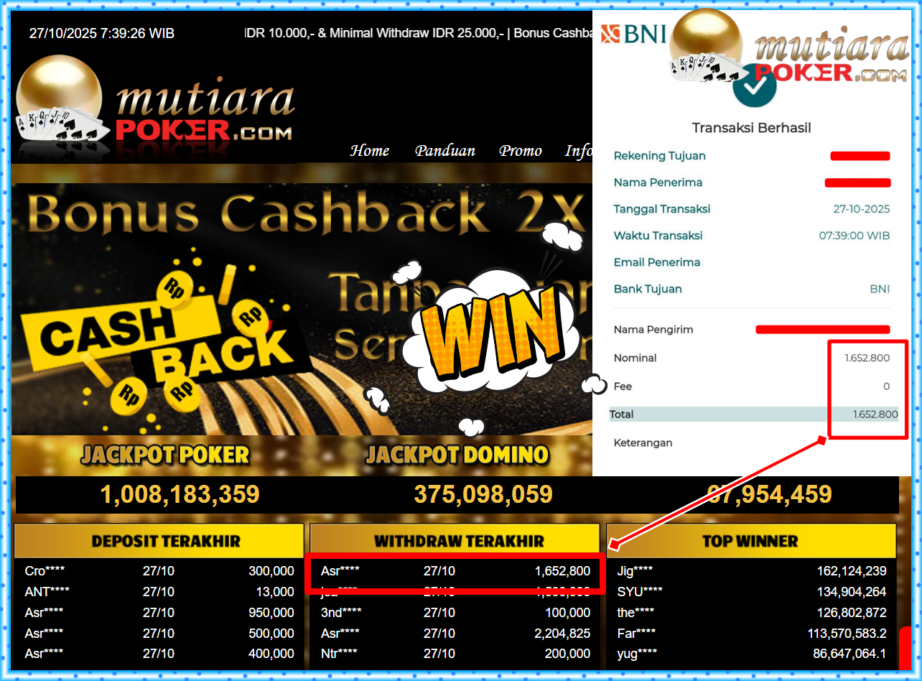 Bukti Withdraw ( 1,652,800,- ) Member Setia MutiaraPoker