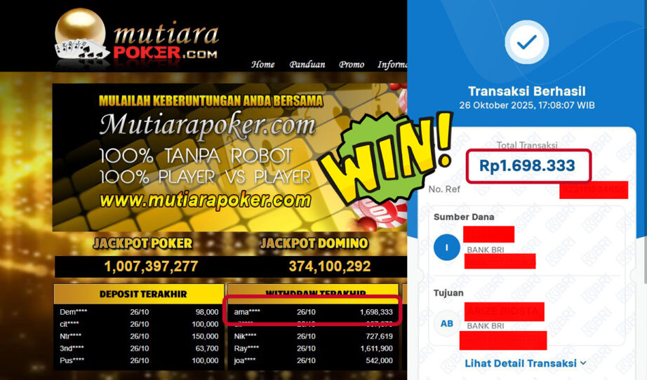 Bukti Withdraw ( 1,698,333,- ) Member Setia MutiaraPoker