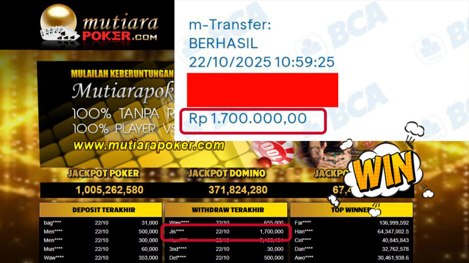 Bukti Withdraw ( 1,700,000,- ) Member Setia MutiaraPokerc