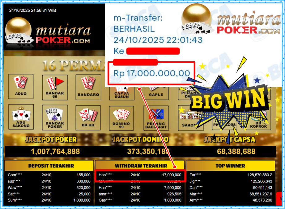 Bukti Withdraw ( 17,000,000,- ) Member Setia MutiaraPoker