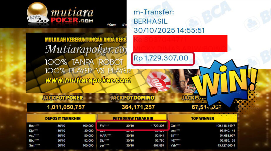 Bukti Withdraw ( 1,729,307,- ) Member Setia MutiaraPoker
