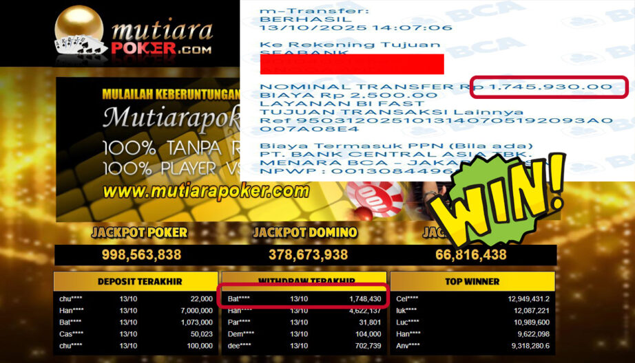 Bukti Withdraw ( 1,748,430,- ) Member Setia MutiaraPoker