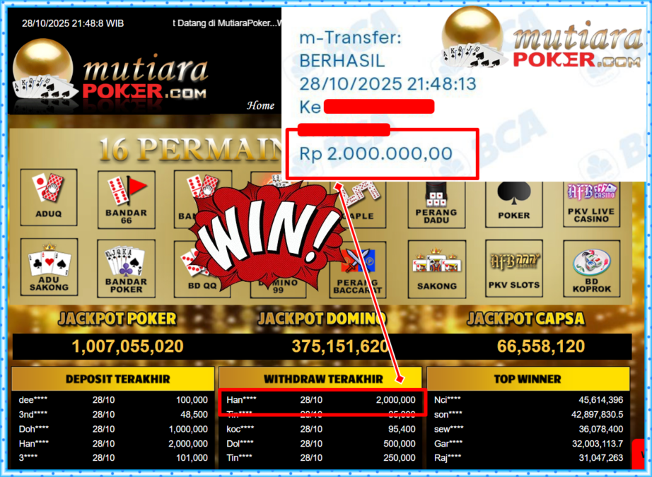 Bukti Withdraw ( 2,000,000,- ) Member Setia MutiaraPoker
