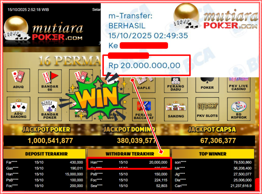 Bukti Withdraw ( 20,000,000,- ) Member Setia MutiaraPoker