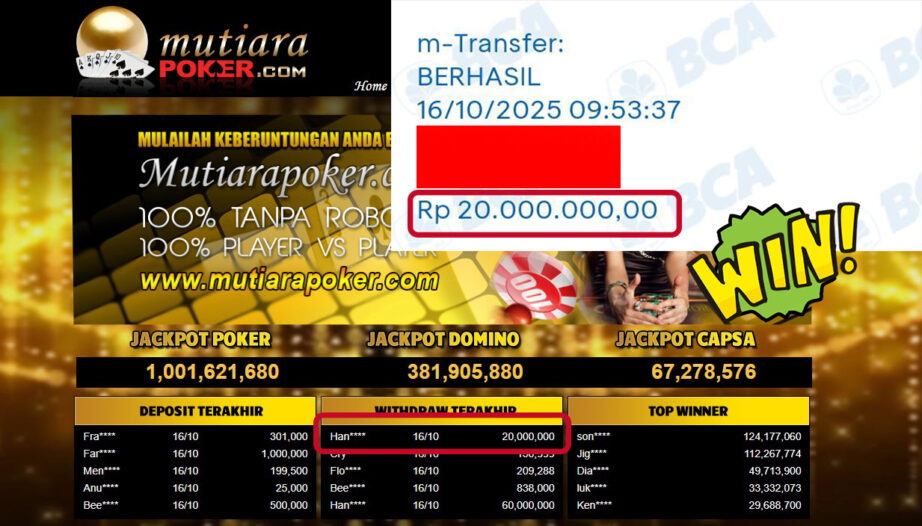 Bukti Withdraw ( 20,000,000,- ) Member Setia MutiaraPoker