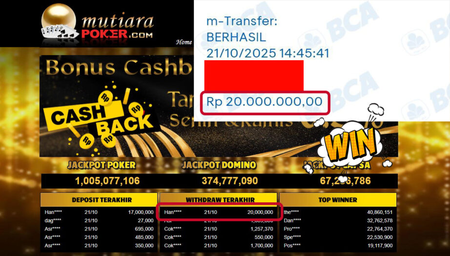 Bukti Withdraw ( 20,000,000,- ) Member Setia MutiaraPokerc
