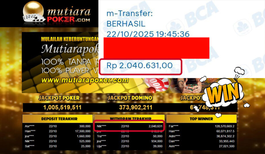 Bukti Withdraw ( 2,040,631,- ) Member Setia MutiaraPokerc