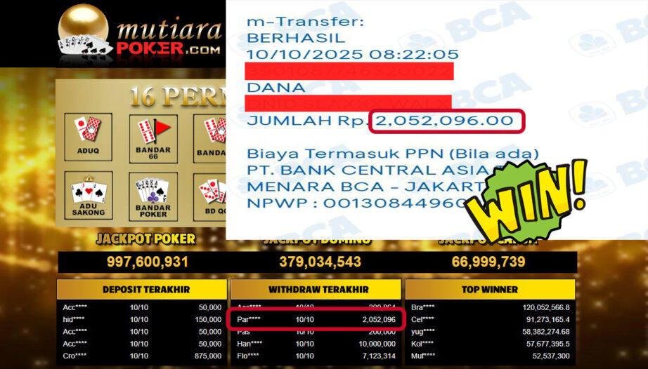 Bukti Withdraw ( 2,052,096,- ) Member Setia MutiaraPoker