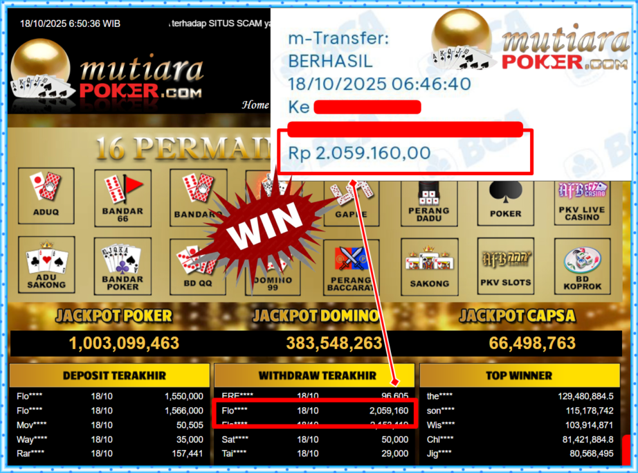 Bukti Withdraw ( 2,059,160,- ) Member Setia MutiaraPoker