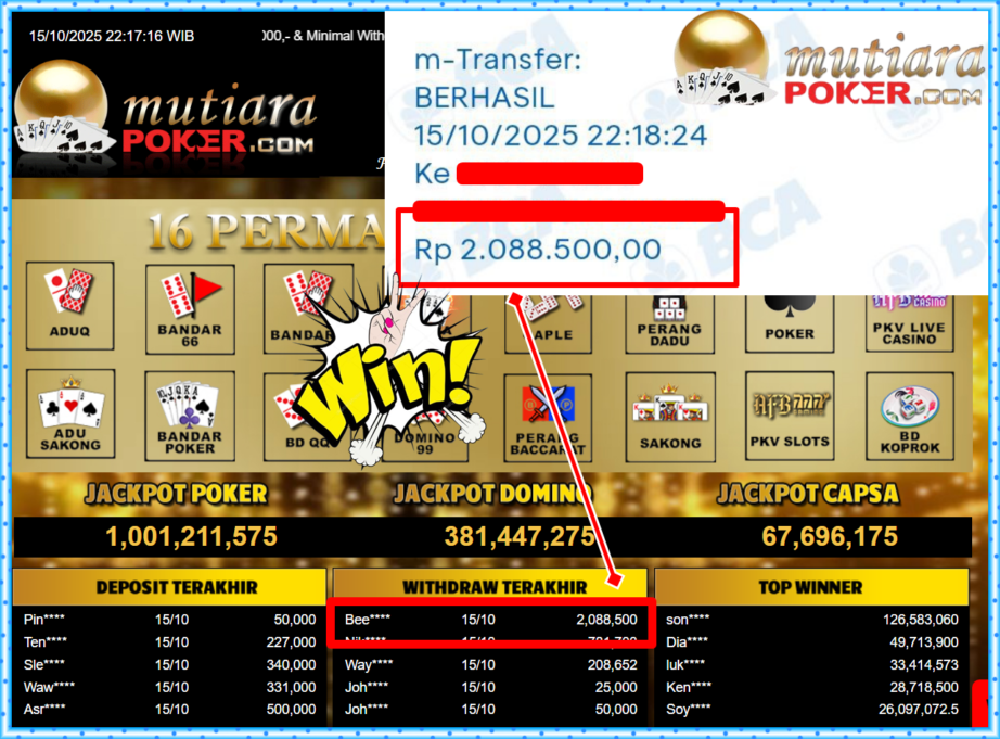 Bukti Withdraw ( 2,088,500,- ) Member Setia MutiaraPoker