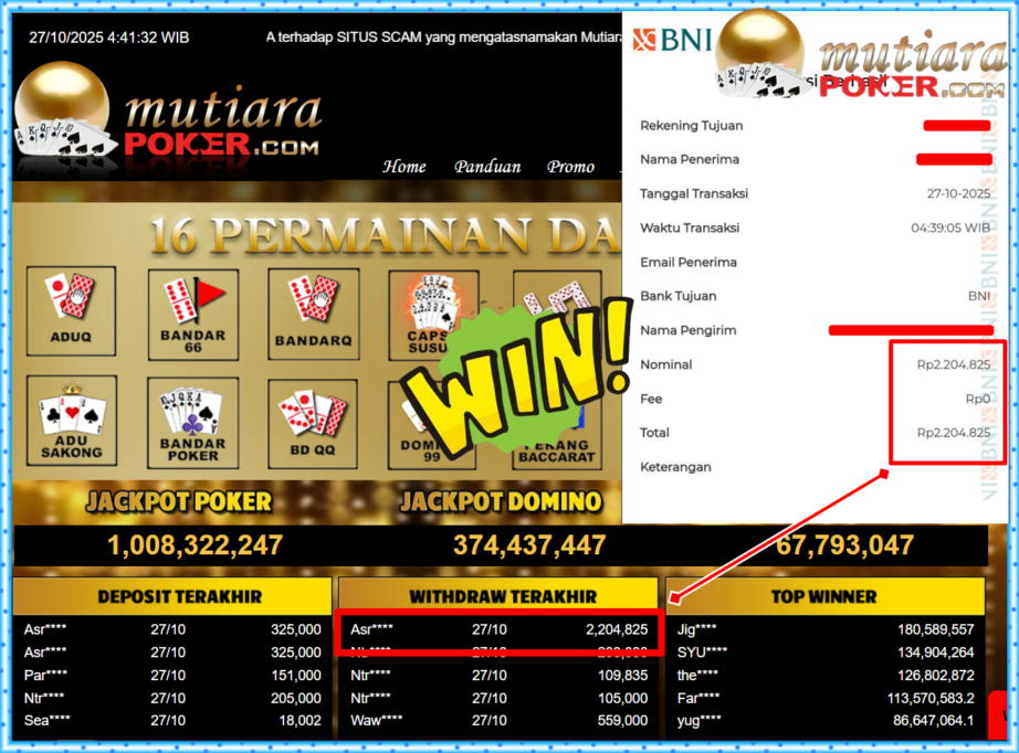 Bukti Withdraw ( 2,204,825,- ) Member Setia MutiaraPoker