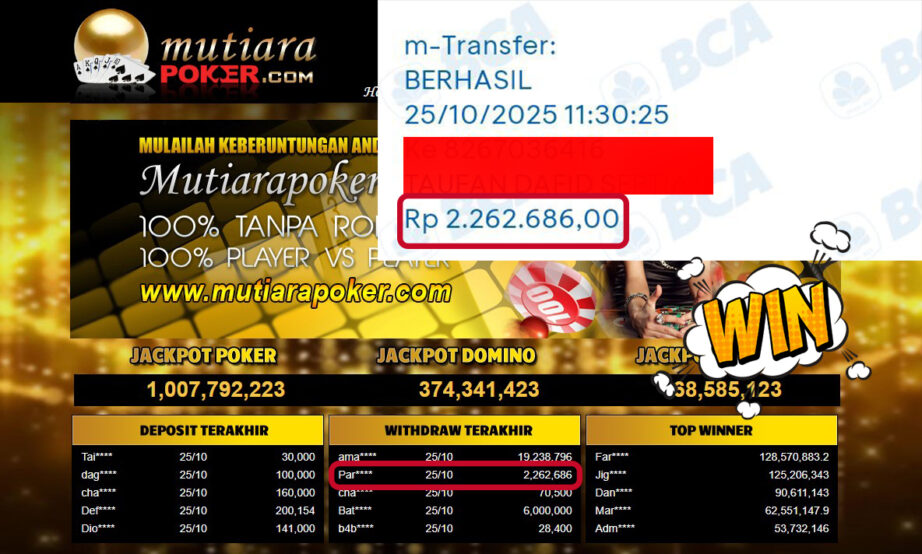 Bukti Withdraw ( 2,262,686,- ) Member Setia MutiaraPoker