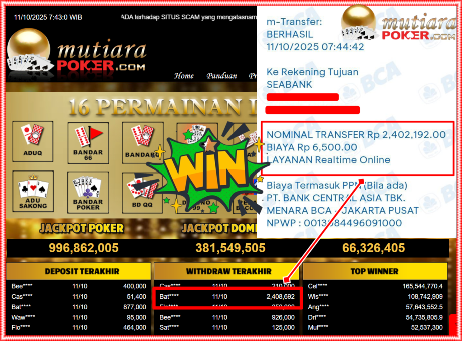 Bukti Withdraw ( 2,408,692,- ) Member Setia MutiaraPoker