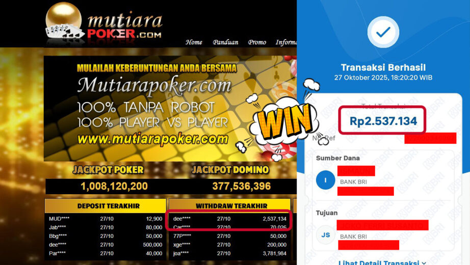 Bukti Withdraw ( 2,537,134,- ) Member Setia MutiaraPoker