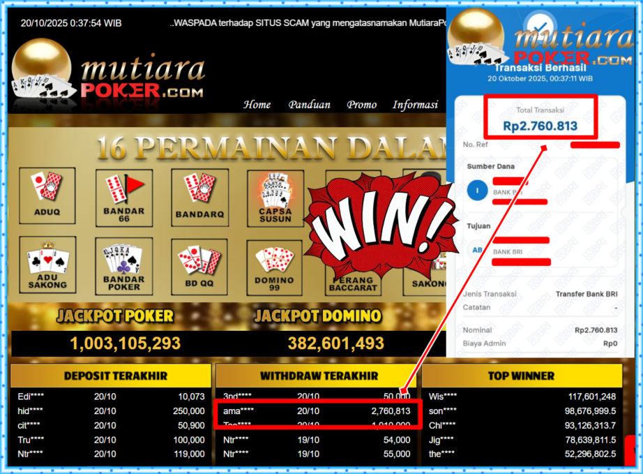 Bukti Withdraw ( 2,760,813,- ) Member Setia MutiaraPoker