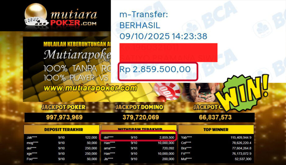 Bukti Withdraw ( 2,859,500,- ) Member Setia MutiaraPoker
