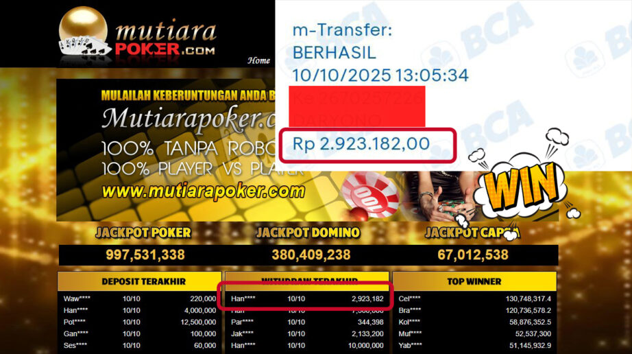 Bukti Withdraw (2,923,182,- ) Member Setia MutiaraPoker