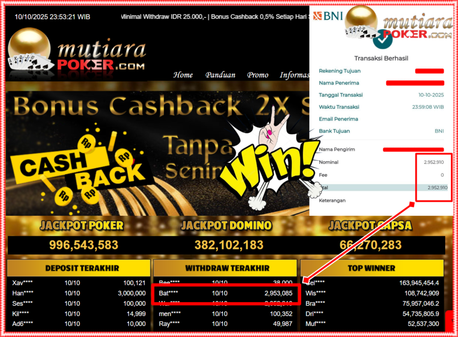 Bukti Withdraw ( 2,952,910,- ) Member Setia MutiaraPoker