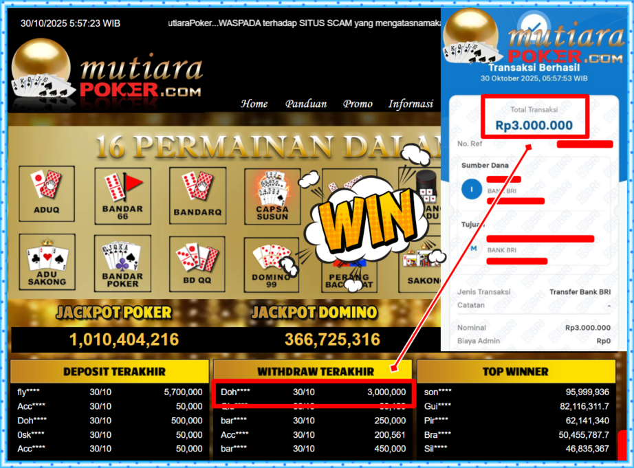 Bukti Withdraw ( 3,000,000,- ) Member Setia MutiaraPoker