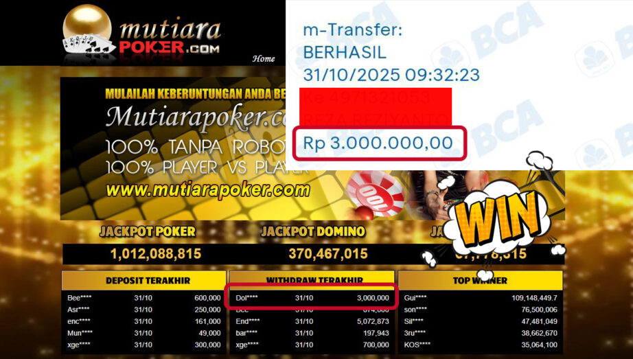 Bukti Withdraw ( 3,000,000,- ) Member Setia MutiaraPoker