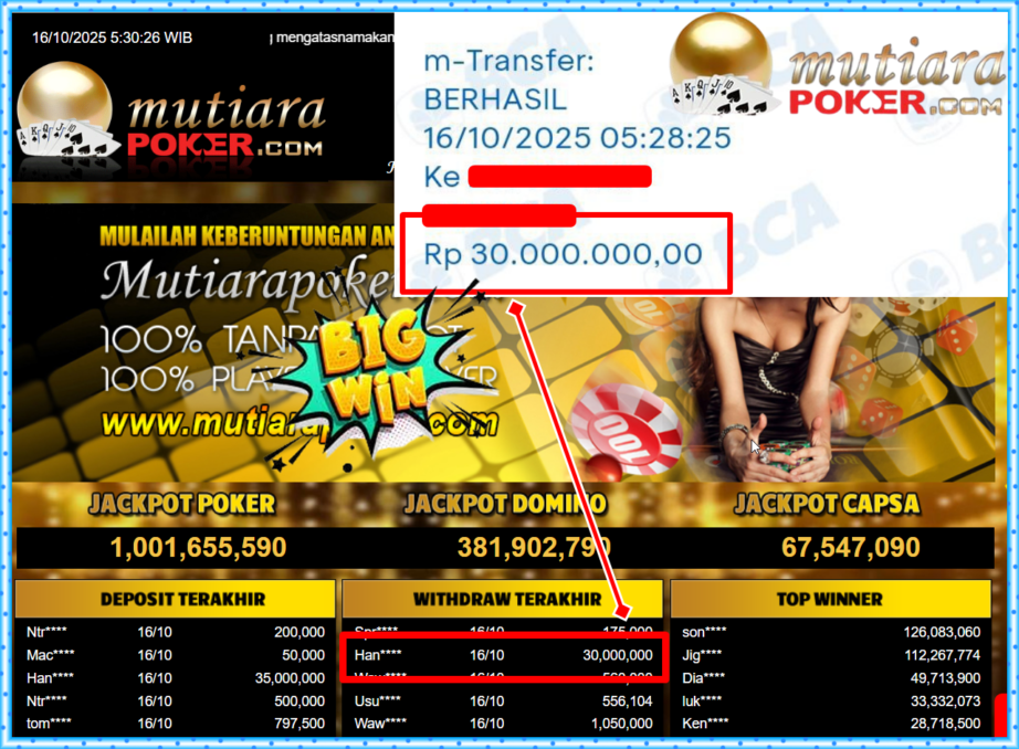 Bukti Withdraw ( 30,000,000,- ) Member Setia MutiaraPoker