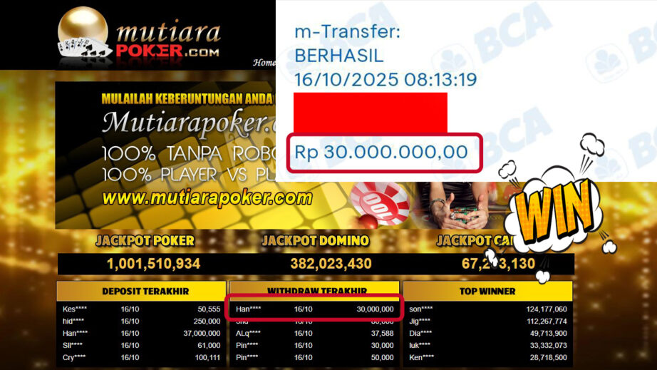 Bukti Withdraw ( 30,000,000,- ) Member Setia MutiaraPoker