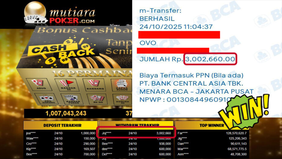 Bukti Withdraw ( 3,002,660,- ) Member Setia MutiaraPokerc