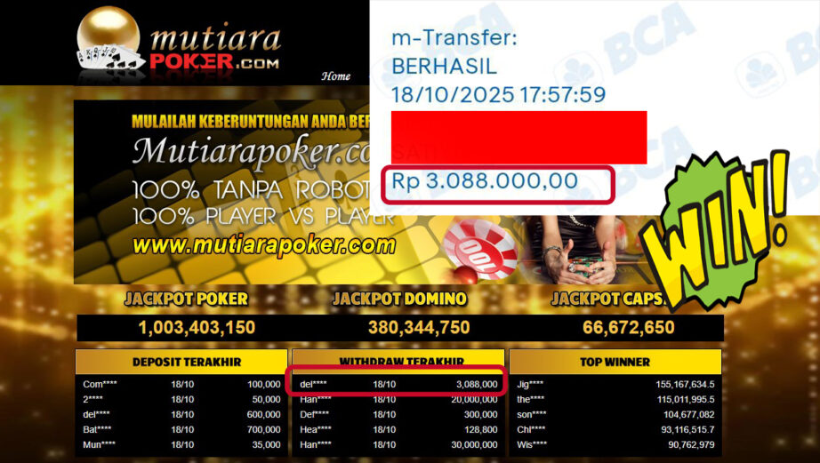 Bukti Withdraw ( 3,088,000,- ) Member Setia MutiaraPoker