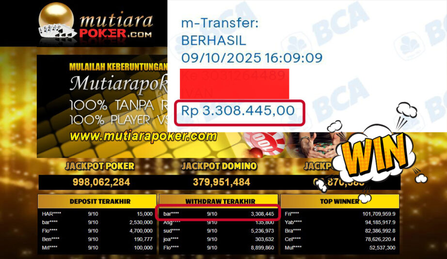 Bukti Withdraw ( 3,308,445,- ) Member Setia MutiaraPoker
