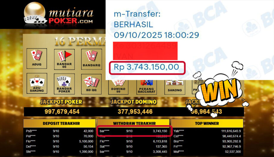 Bukti Withdraw ( 3,743,150,- ) Member Setia MutiaraPoker