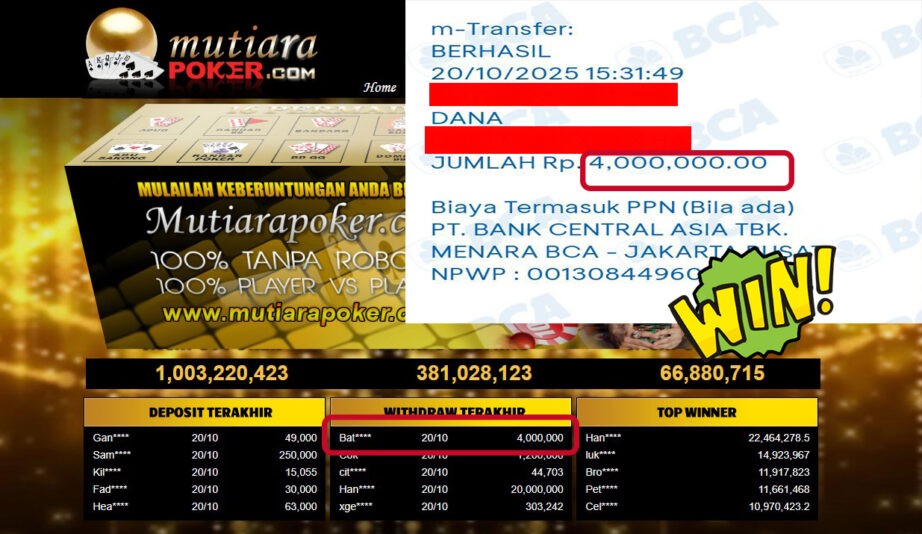 Bukti Withdraw ( 4,000,000,- ) Member Setia MutiaraPokerc