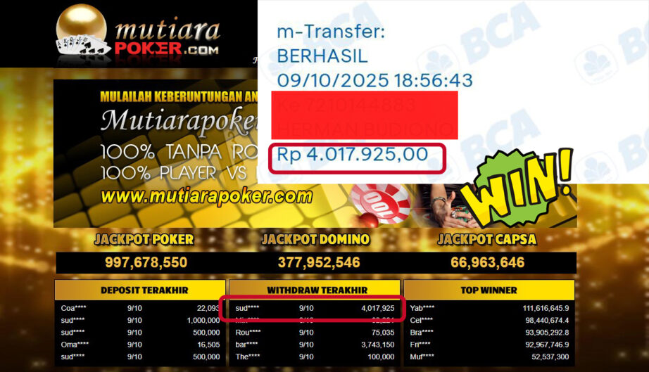 Bukti Withdraw ( 4,017,925,- ) Member Setia MutiaraPoker