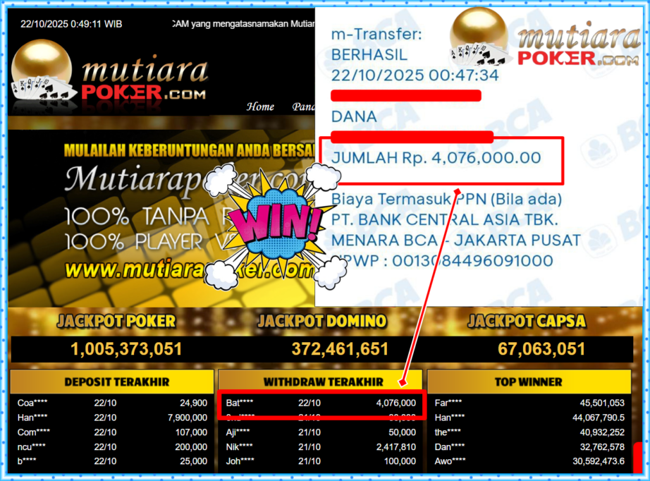 Bukti Withdraw ( 4,076,000,- ) Member Setia MutiaraPokerc