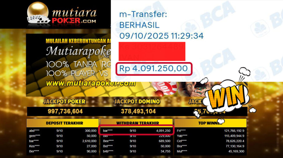 Bukti Withdraw ( 4,091,250,- ) Member Setia MutiaraPoker