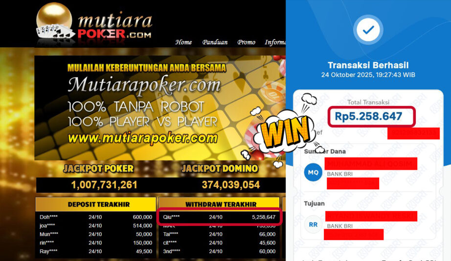 Bukti Withdraw ( 5,258,647,- ) Member Setia MutiaraPoker